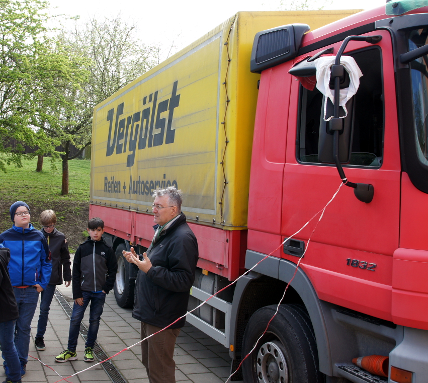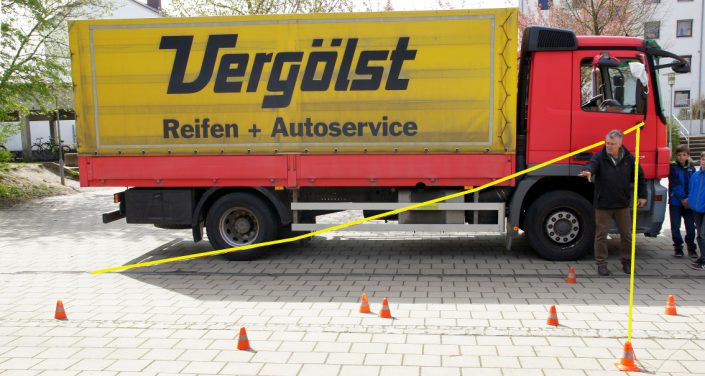 Was ist der „tote Winkel“? Sicher haben wir schon alle einmal davon gehört, dass man als Fahrer den Bereich rechts neben dem Fahrzeug nicht vollständig einsehen kann. Wie groß dieser Bereich bei LKWs und Bussen tatsächlich ist, das lernt man am besten durch Ausprobieren. Genau aus diesem Grund hat Herr Schräpler auch dieses Jahr die 6. Klassen des Luggy mit dem Fahrschul-LKW besucht. Vor allem zu Beginn der Fahrradsaison ist es wichtig, sich alle ernsthaften Gefahren noch einmal ins Gedächtnis zu rufen. Gespickt mit allerlei Anekdoten aus dem Alltag eines Fahrlehrers erfuhr jeder unserer Schüler in kurzweiliger Weise und auch vom Sitz eines LKWs aus, dass eine ganze Schulklasse im toten Winkel unsichtbar ist. Lediglich einzelne Schüler, die sich neben den Bereich stellen können gesehen werden. Wie verhält man sich also als Radfahrer richtig? Ist man mit dem Fahrrad neben ein großes Fahrzeug geraten heißt es: Abstand halten, Augenkontakt zum Fahrer suchen und aus dem toten Winkel herausfahren!