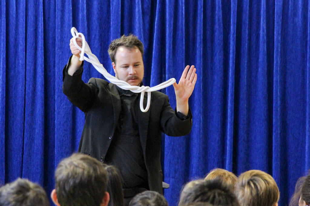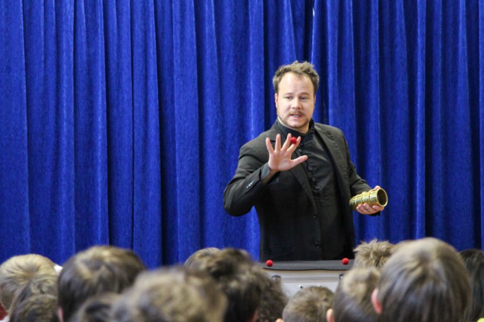 Dabei zeigte sich, dass das Wesentliche für die Augen tatsächlich unsichtbar ist. Denn – so das Motto des kleinen Prinzen – man sieht nur mit dem Herzen gut. Und manchmal sind die Dinge nicht so wie sie scheinen. Im „Kleinen Prinzen“ stellt sich eine Zeichnung von einem Hut als Schlange heraus, die einen Elefanten verschlungen hat. Bei der Zaubershow von Max Schneider entpuppt sich der in einer Box erspürte Schlüssel plötzlich als eine Dose mit Bratheringen. Und wie von Zauberhand taucht ein mit den Initialen einer Zuschauerin versehenes Seidentuch in einem frisch zerteilten Apfel wieder auf. Dabei gelingt die Illusion so perfekt, dass man sich unwillkürlich fragt, ob all das wirklich nur ein Trick ist. Zum Lachen brachte er das junge Publikum mit der Geschichte des chinesischen Zauberers Xin, der einem Kollegen – auf Chinesisch natürlich – einen Zaubertrick verrät, der scheinbar nicht sofort gelingen will. Einzelne Schüler durften bei einigen Kunststücken assistieren und so flogen Bälle unsichtbar für die Augen der Zuschauer von einer Hand zur nächsten und ein kleiner Tisch schwebte auf zauberhafte Weise über die Bühne. Genau aufgepasst haben die Kinder und Jugendlichen auch bei einem Zaubertrick zum Mitmachen und sie hätten nur zu gerne auch gewusst, wie die anderen Tricks funktionieren – aber das bleibt wohl das Geheimnis unseres Zauberkünstlers, der ein Absolvent des Ludwigsgymnasiums ist. Neben dem Studium der Philosophie und der französischen Sprache absolvierte er eine Schauspielausbildung in München und hat sein Hobby, die Zauberei, auch zum Beruf gemacht. Mittlerweile ist er auf der ganzen Welt unterwegs. Mit seiner Liebe zur Zauberei und Begeisterung für Frankreich hat er sicherlich auch die jungen Zuschauer anstecken können.
