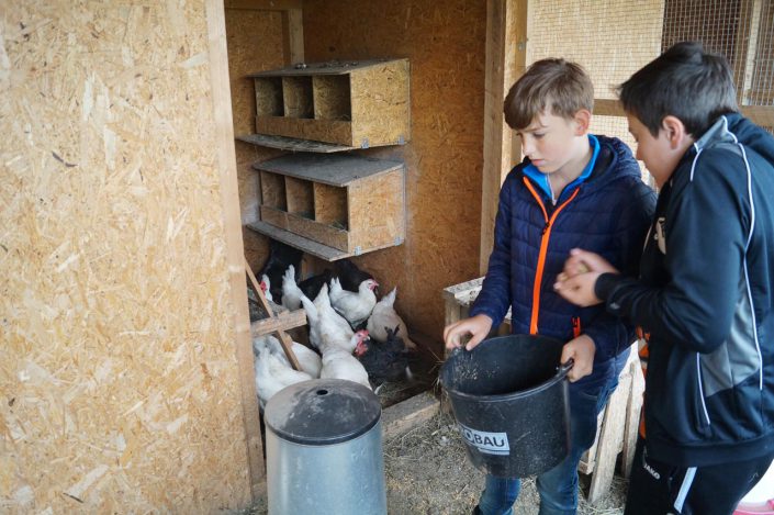 Die erste Station der Exkursion war der Besuch des Pferdestalles. Hier lernten die Schülerinnen und Schüler viel über die richtige Haltung und Fütterung der Tiere und durften auch selbst die morgentliche Fütterung der Pferde mit Heu und Hafer übernehmen. Neben den Pferden beherbergt der Biobauernhof zudem eine beeindruckende Anzahl verschiedenster Hühnerrassen, die als nächstes besucht wurden. Die Schülerinnen und Schüler erhielten dabei die einmalige Möglichkeit, die knapp eine Woche alten Küken auch einmal selbst in der Hand zu halten. Anschließend übernahm die Klasse auch bei den Hühnern die morgentliche Fütterung und ließ die Tiere, die auf dem Biobauernhof tagsüber frei herumlaufen dürfen, aus dem Stall.