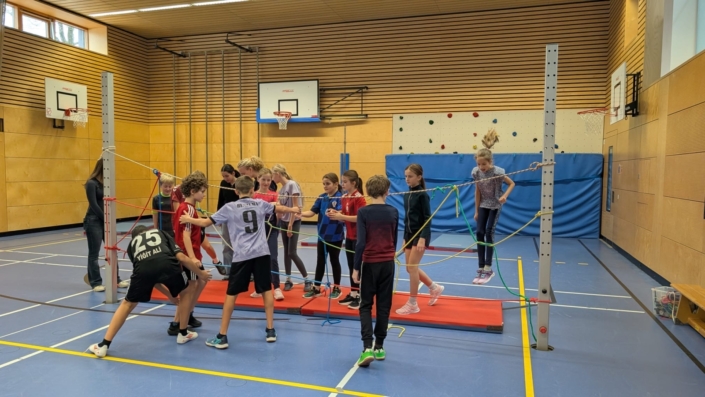Nach einigen weiteren Stationen am „Spinnennetz“ angekommen, mussten die Fünftklässler durch unterschiedlich große Öffnungen eines Seilnetzes gelangen. Planung, Absprache und gegenseitige Unterstützung standen hier im Mittelpunkt – und zeigten eindrucksvoll, wie gut eine Gruppe funktionieren kann, wenn jeder seine Stärken einbringt.