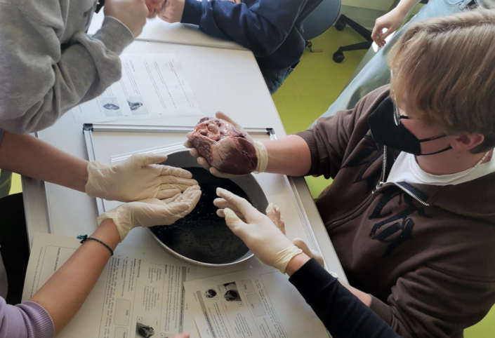 Systole, Diastole, Herzkranzgefäße, Aorta, EKG und Kammerflimmern sind nur ein paar Schlagworte, die in der Theorie gegen Ende des ersten Halbjahres behandelt wurden. Da es sich aber um ein lebendiges Organ handelt, bietet es sich hier an, das theoretische Wissen in die Praxis umzusetzen. Schweineherzen sind in ihrer Größe ungefähr vergleichbar mit dem menschlichen Herzen und so wurden in der Klasse 10b bei Frau Cao und in der Klasse 10a bei Herrn Dr. Glaser dieses Schuljahr eben diese Schweineherzen präpariert.