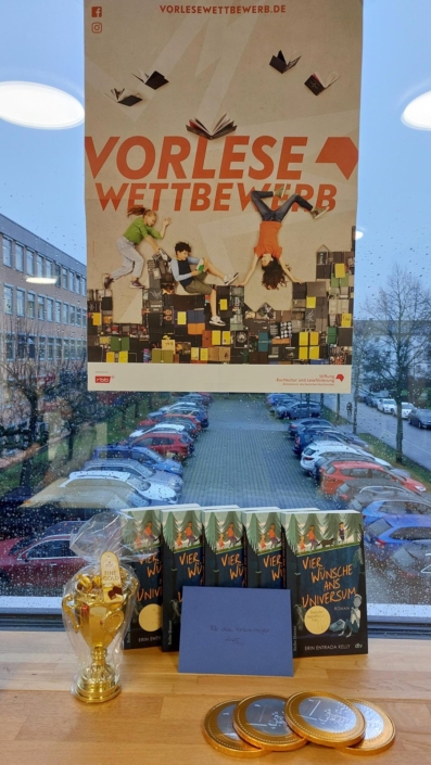 Aber keine der Teilnehmerinnen ging am Ende leer aus, alle erhielten als Buchpreis den Jugendroman Vier Wünsche ans Universum von Enrin Entrada Kelly sowie eine Schokoladenmedaille als Dank für Ihre Leistung.