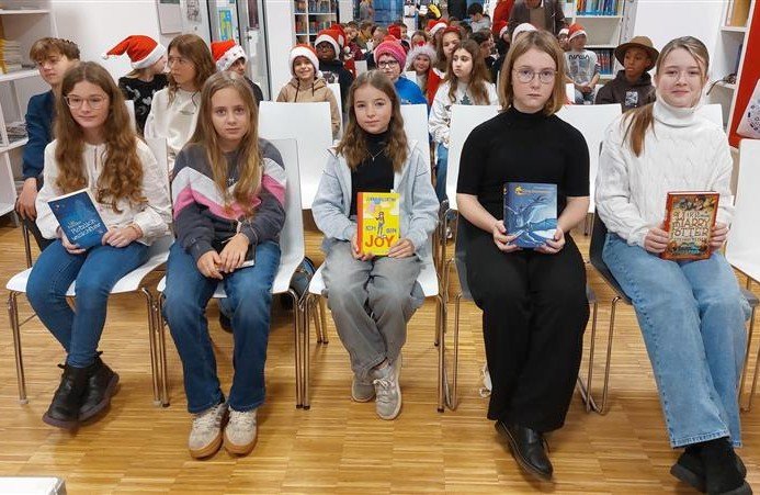 Am Montag, den 8.12.2025 war es wieder soweit: Die besten fünf Leserinnen der sechsten Jahrgangsstufe traten in der Schulbibliothek mit ihren selbst mit gebrachten Geschichten gegeneinander im Vorlesen an. Aufgeregte Blicke, klopfende Herzen und Bücher, die fest umklammert wurden – die Spannung bei im Raum war greifbar. Unterstützt von den Viertklässlern der Grundschule St. Josef II präsentierte Amelie Zollner aus der Klasse 6a einen Auszug aus dem Jugendbuchklassiker Harry  Potter und der Stein der Weisen von Joanne K. Rowling, Kalotta Kremer aus der Klasse 6b las aus dem Buch Drachenreiter von Cornelia Funke, Valentina Irmer aus der Klasse 6c hatte sich das Buch Ich bin Joy von Jenny Valentine ausgesucht ,Vanessa Palmer aus der Klasse 6d stellte das Buch Mystery Club von Fiona Kelly vor und Sarah Jungtäubl aus der Klasse 6e las aus dem Buch Plötzlich  unsichtbar von Liz Kessler.