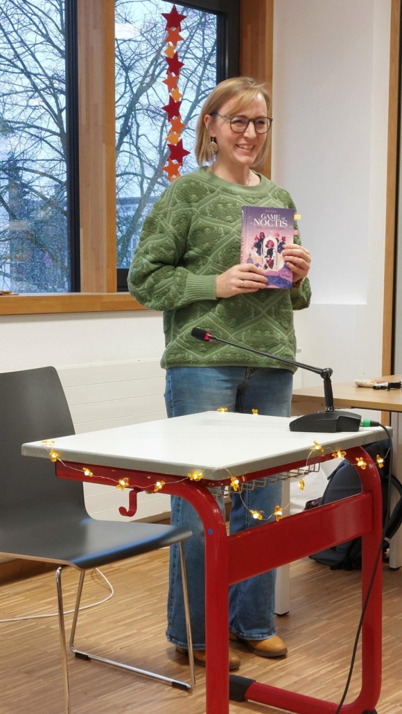 Alle fünf präsentierten kurze, zuhause vorbereitete Textauszüge aus diesen Lieblingsbüchern und zeigten damit, wie lebendig laut vorgelesene Literatur sein kann. Eine weitere, noch anspruchsvollere Aufgabe bekamen die Leserinnen in der zweiten Runde, als sie einen unbekannten Textauszug aus dem Buch Game of noctis – Spiel um dein Leben von Deva Fagan interpretieren durften, das Frau Vogel, die Leiterin der Schulbibliothek, ausgesucht hatte.